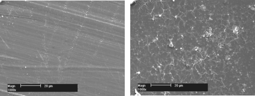 40~180℃、10%硫酸液/汽環(huán)境中加速試驗(yàn)后GDAPC雜化聚合材料(圖左)與其國(guó)外耐溫聚合物(圖右)的表面形貌對(duì)比圖