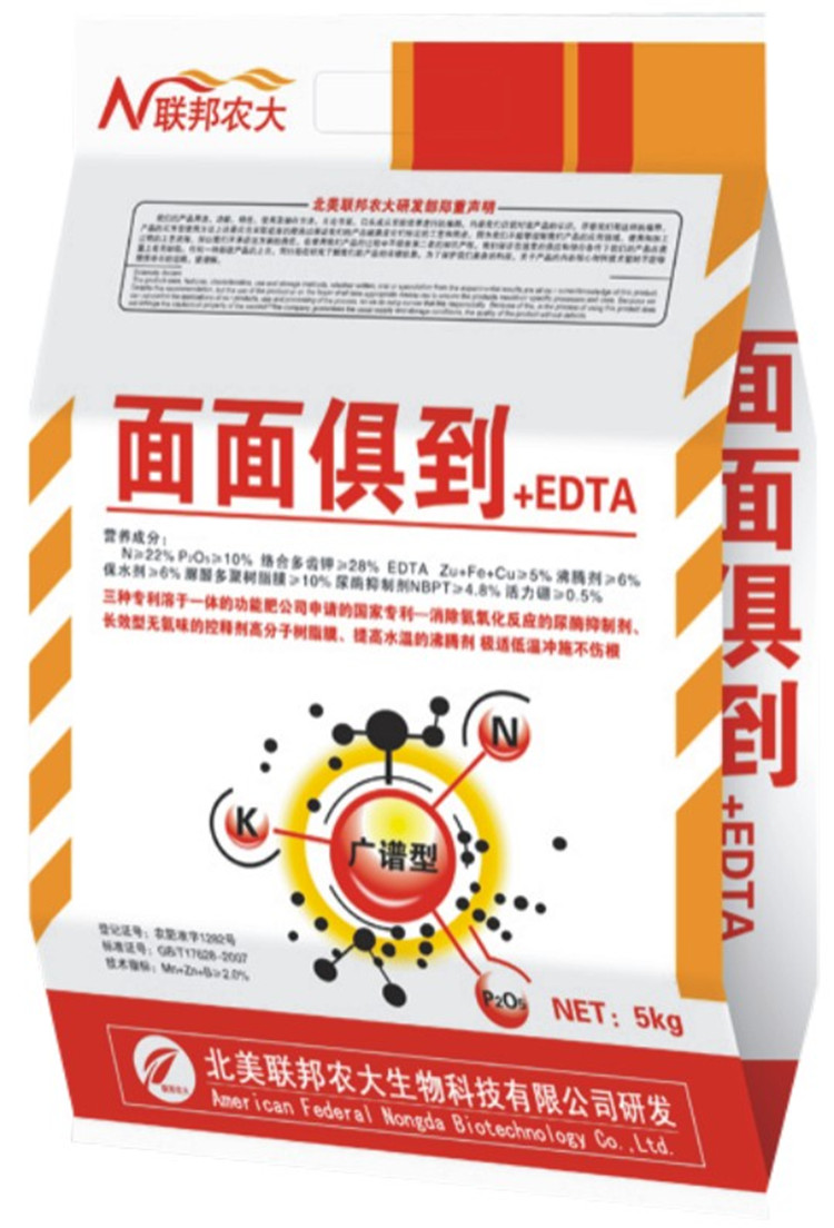 面面俱到+EDTA:營(yíng)養(yǎng)全面、生根膨果、效果神奇 產(chǎn)品名稱:特效沖施肥——面面俱到+EDTA 營(yíng)養(yǎng)成分:N≥22%;P2O5≥10%;絡(luò)合多齒鉀≥28%;EDTA Zn+Fe+Cu+Mn≥5%;沸騰劑≥6% ;保水劑≥6%;尿醛多聚樹脂膜≥10%;尿酶抑制劑NBPT≥4.8%;活力硼≥0.5%。