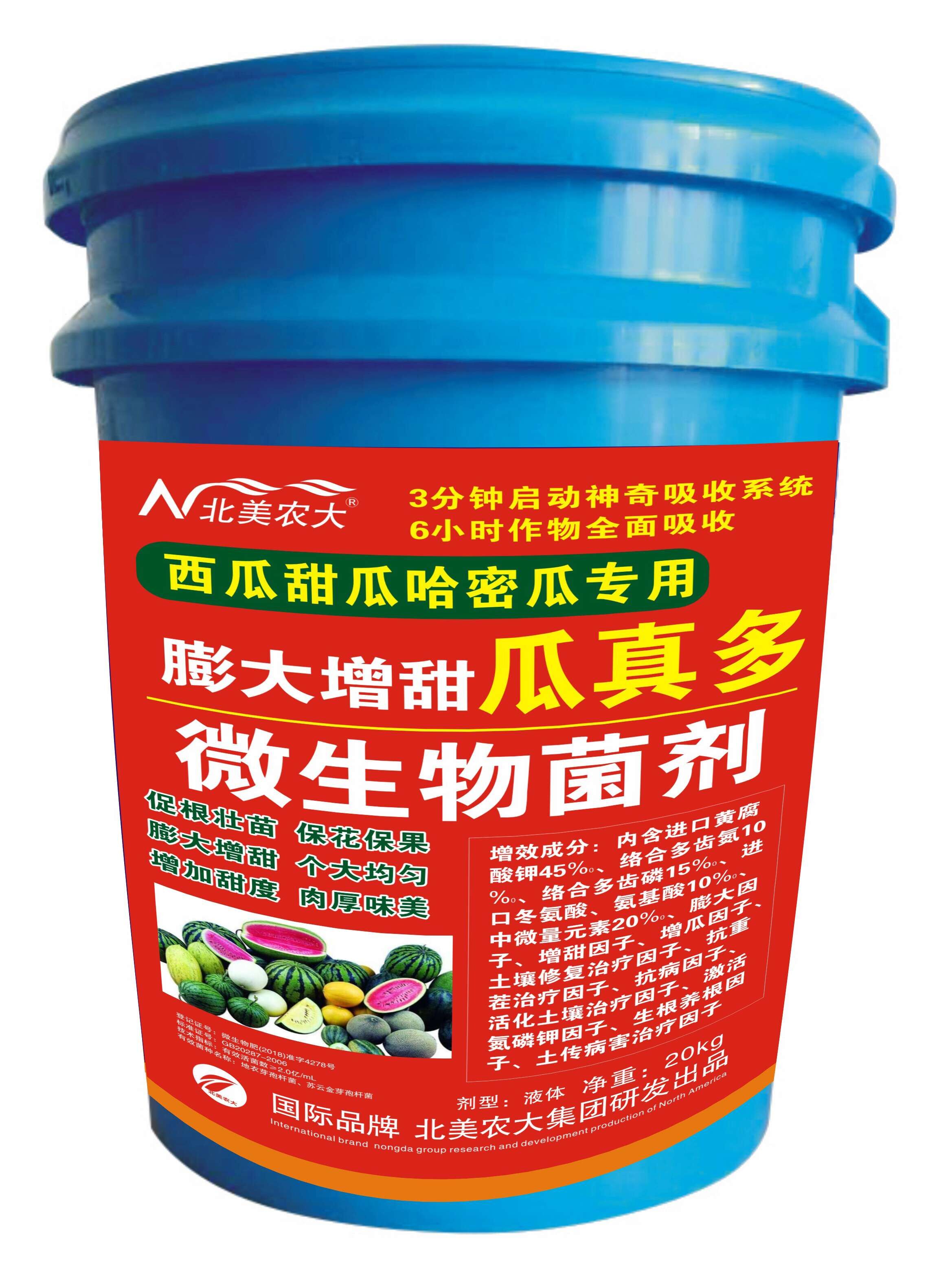 本品是北美農(nóng)大集團與美國杜克公司針對西瓜、甜瓜、哈密瓜研發(fā)的一種特效微生物營養(yǎng)功能型復合高端沖施肥,特別針對作物不同生長階段的營養(yǎng)需求,提供定向營養(yǎng)輸入有效改善土壤微生物環(huán)境,促進土壤中養(yǎng)分的釋放,根系發(fā)達,營養(yǎng)吸收能力增強,葉片濃綠,光合作用增強,提高植株自身抗逆性能,促根壯苗、?;ū9⒃鰪娢?、膨大增甜、瓜多瓜重,顯著提高產(chǎn)量和品質(zhì)。使土壤中氮磷鉀被二次吸收利用,使作物發(fā)根多、吸收快、膨大增甜、轉(zhuǎn)色快,強大的根系營養(yǎng)輸送網(wǎng),使作物養(yǎng)分一分鐘吸收十分鐘傳導到作物各個部位,使作物哪里需要養(yǎng)分哪里快速補充到作物各個部位,使作物高產(chǎn)、豐產(chǎn)必不可缺的第三代沖施肥精品。