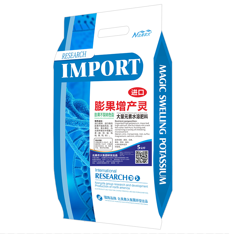 進(jìn)口膨果增產(chǎn)靈是從國(guó)外進(jìn)口高端鉀元素、鈣元素,膨果不裂轉(zhuǎn)色快,膨果快、果大果紅,內(nèi)含各種螯合中微量元素(硼、鋅、錳、鐵、硫、鎂、鈣、硅)和傳導(dǎo)因子、促長(zhǎng)因子、膨果因子。能促進(jìn)作物重復(fù)吸收和利用,吸收快、傳導(dǎo)快,它的效果是普通產(chǎn)品的2-3倍。最大利用率達(dá)到99%以上。北美農(nóng)大集團(tuán)研發(fā)部根據(jù)中國(guó)不同種作物在生長(zhǎng)期、膨果期需要不同元素,有針對(duì)性聯(lián)合研發(fā)的生根、生長(zhǎng)、膨果專用型特效肥。本品含有速效加長(zhǎng)效的進(jìn)口鉀元素、鈣元素等有利于作物生長(zhǎng)、膨果。主根豎直,側(cè)根系發(fā)達(dá),強(qiáng)壯的根系網(wǎng)養(yǎng)分吸收傳快,膨果快、無(wú)生理病害及裂果。是當(dāng)前水溶肥第四代精品。