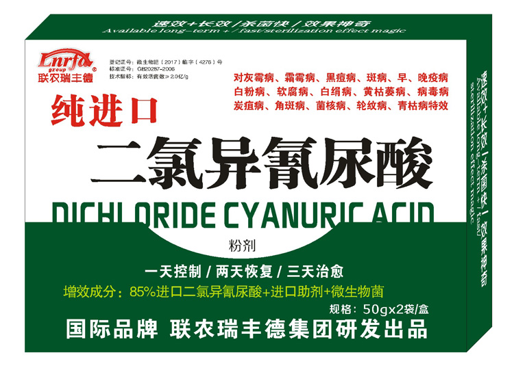 本品由聯(lián)農(nóng)瑞豐德集團(tuán)與中國(guó)農(nóng)科院采用進(jìn)口二氯異氰尿酸和微生物菌和進(jìn)口助劑復(fù)配而研發(fā)一種特效型產(chǎn)品,對(duì)真菌、細(xì)菌、病毒等各種病害殺菌快、傳導(dǎo)快、吸收快、雙重營(yíng)養(yǎng)特效產(chǎn)品;對(duì)作物一秒鐘殺菌,3秒鐘補(bǔ)充營(yíng)養(yǎng),10分鐘傳導(dǎo)在作物各個(gè)部位,其效果是同類普通產(chǎn)品的2-3倍,使作物重復(fù)殺菌,快速吸收營(yíng)養(yǎng),殺菌率達(dá)到98%以上。