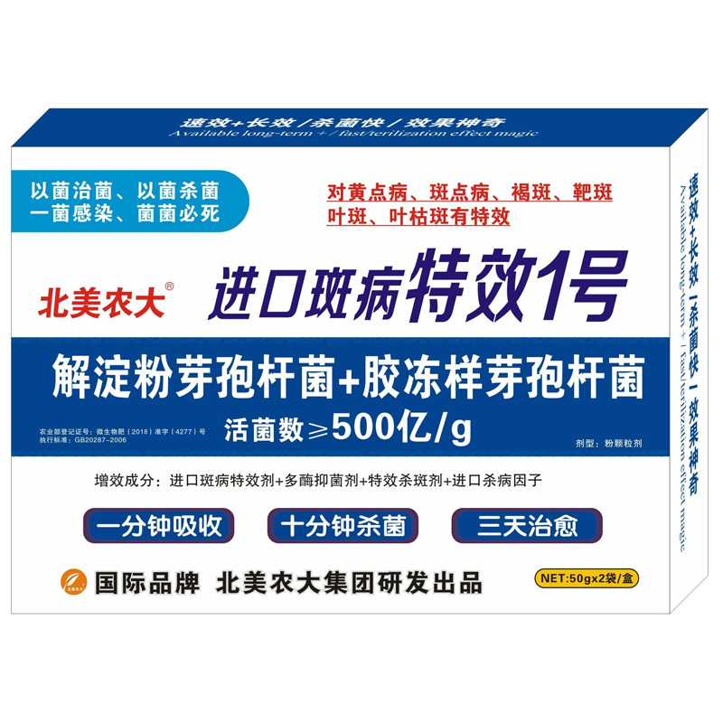 本品由北美農(nóng)大集團與美國杜克公司針對黃點病、斑點病、褐斑、靶斑、葉斑、葉枯斑而研發(fā)一種純微生物特效產(chǎn)品,對作物上的病害以菌治菌、以菌殺菌、一菌感染、菌菌必死的獨特效果,對病害一天控制、兩天恢復、三天治愈的神奇效果,是同類普通產(chǎn)品的3-5倍,使作物重復殺菌,殺菌率達到98%以上。