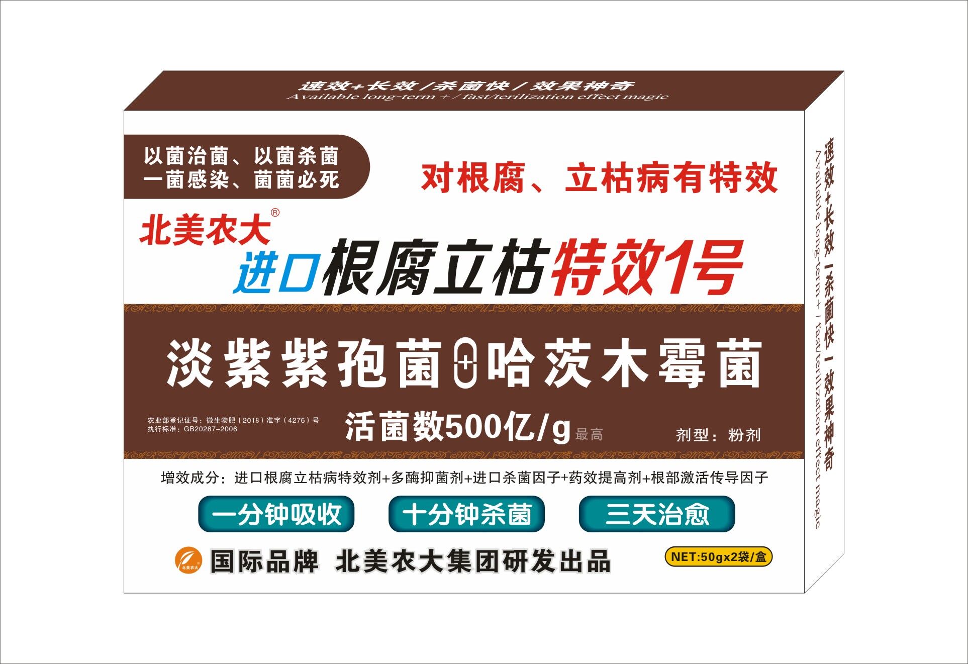 本品由北美農(nóng)大集團(tuán)與美國杜克公司針對(duì)根腐、立枯病而研發(fā)一種純微生物特效產(chǎn)品,對(duì)作物上的病害以菌治菌、以菌殺菌、一菌感染、菌菌必死的獨(dú)特效果,對(duì)病害一天控制、兩天恢復(fù)、三天治愈的神奇效果,是同類普通產(chǎn)品的3-5倍,使作物重復(fù)殺菌,殺菌率達(dá)到98%以上。