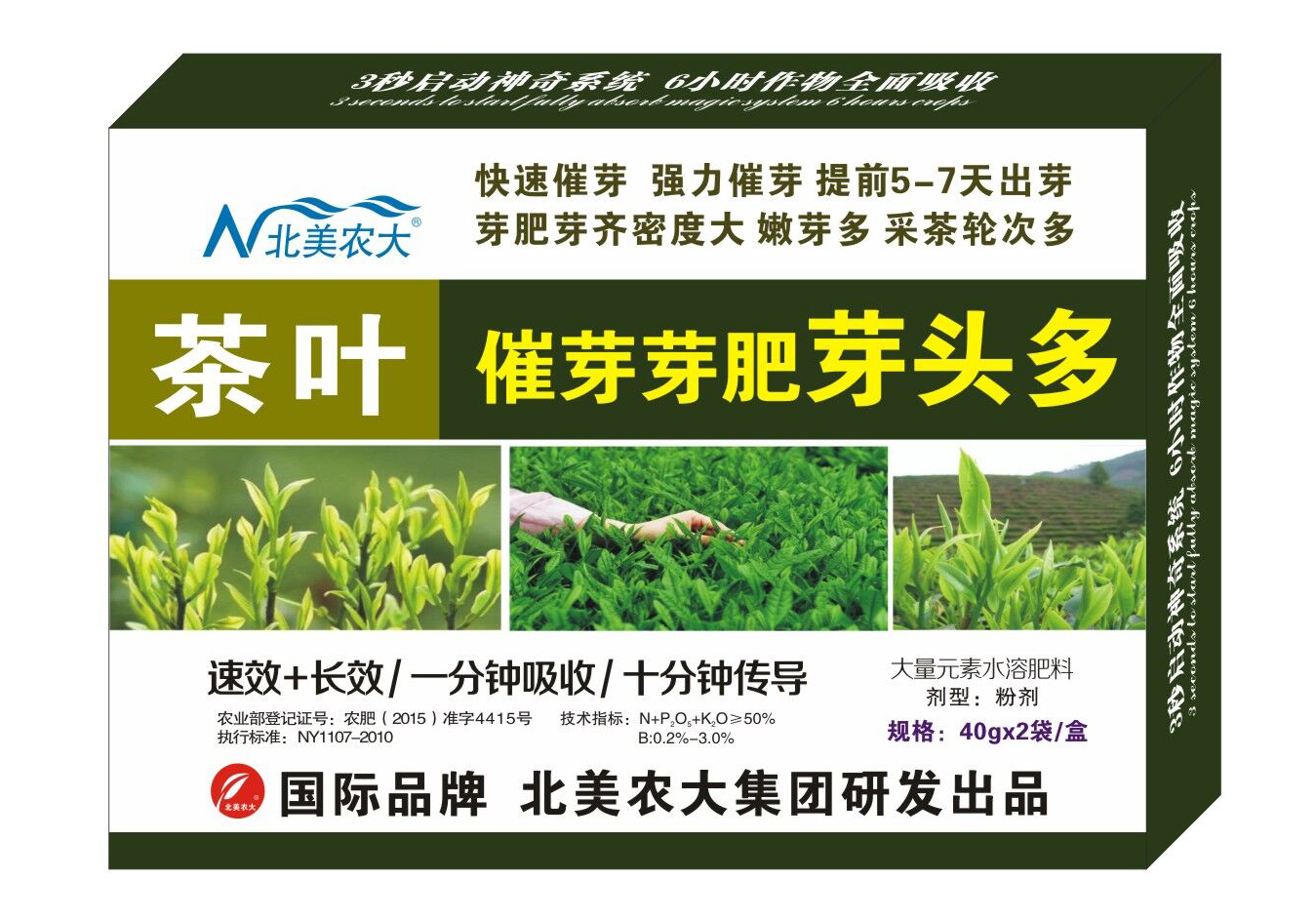 本品是北美農(nóng)大集團(tuán)與中國農(nóng)科院共同研發(fā)的針對茶葉茶芽分化的一種神奇因子,能迅速促進(jìn)快速催芽、強(qiáng)力催芽、提前5-7天出芽、芽肥芽齊密度大、嫩芽多、采茶輪次多;本品含量高、見效快、易吸收,滲透力強(qiáng),迅速達(dá)到兩天起變化、五天見神效的神奇效果,迅速促進(jìn)作物主軸和側(cè)軸先端茶芽形成,從而起到生長點(茶芽)變長,肥厚隆起,茶芽原體形成,達(dá)到作物茶芽增多、茶芽壯,噴施本品能促進(jìn)作物茶芽內(nèi)碳氮比增加,提高作物葉片和短縮莖里碳水化合物含量,促進(jìn)茶芽數(shù)量增加,增強(qiáng)作物免疫系統(tǒng),抗病、抗逆、抗重茬、抗旱、抗寒等特點,從而起到增產(chǎn)增收作用。