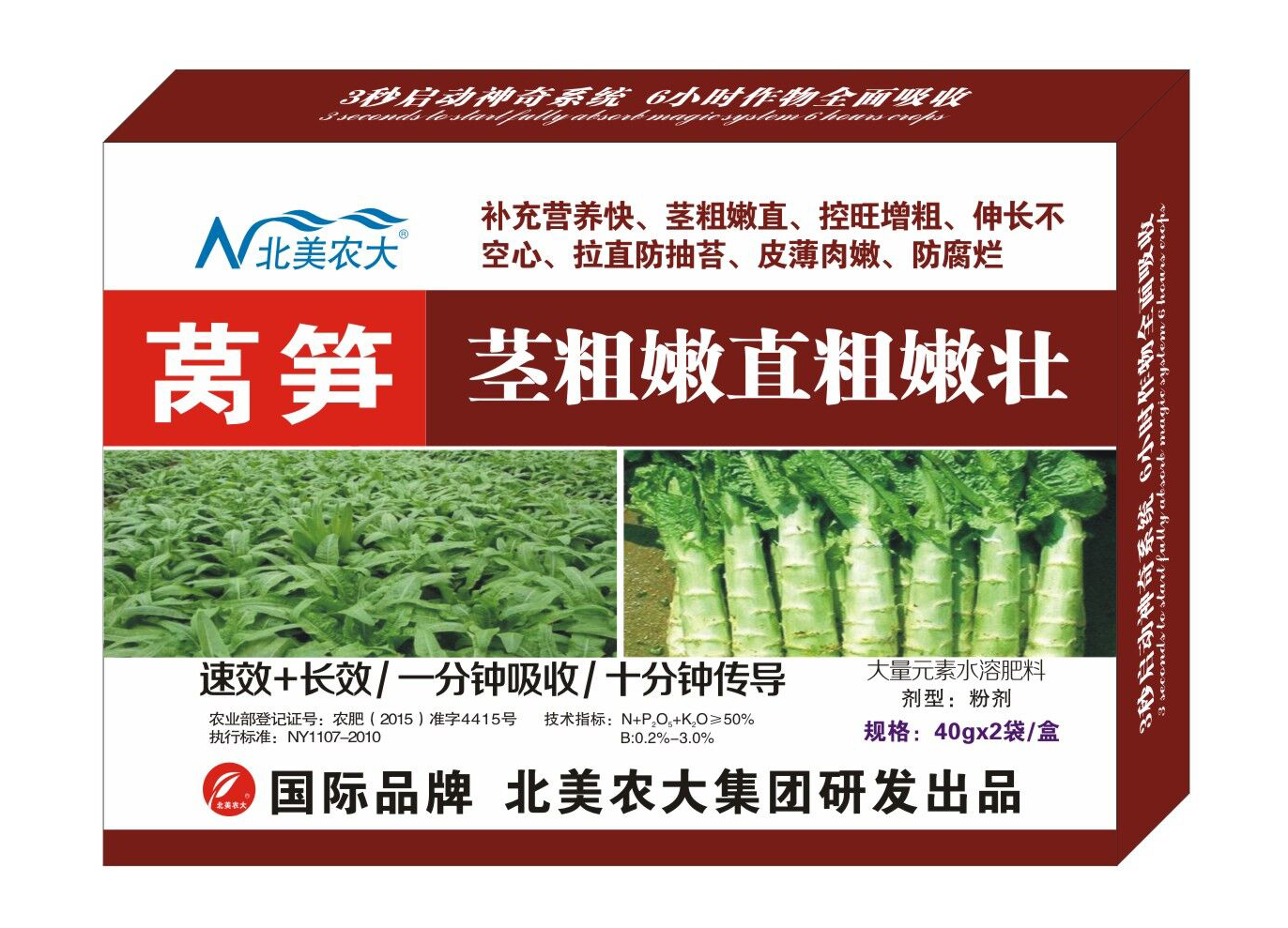 產(chǎn)品特點(diǎn): 本品是北美農(nóng)大集團(tuán)與中國(guó)農(nóng)科院針對(duì)萵筍生長(zhǎng)特點(diǎn)研制,內(nèi)含作物生長(zhǎng)所必須的生長(zhǎng)發(fā)育促長(zhǎng)成分NAA、生長(zhǎng)特效劑,特別添加能大幅提高產(chǎn)量的4-IPA,維生素類,抗真細(xì)菌抗病毒活性酶,多種氨基酸、維生素,氮、磷、鉀、鈣、硼、錳、鋅、鉬、鐵等多種元素、活性劑及包心劑等。施用本品能促進(jìn)作物細(xì)胞分裂,分化和伸長(zhǎng),激發(fā)強(qiáng)大的萌根分蘗能力,促進(jìn)植株健壯根網(wǎng)系統(tǒng)的覆蓋生長(zhǎng),強(qiáng)壯植株,長(zhǎng)勢(shì)快,增強(qiáng)光合作用,提高葉綠素含量,補(bǔ)充營(yíng)養(yǎng)快、莖粗嫩直、控旺增粗、伸長(zhǎng)不空心、拉直防抽苔、皮薄肉嫩、防腐爛產(chǎn)量倍增,提高上市10-20天。本品對(duì)作物缺素造成的小葉、黃葉、卷葉、不長(zhǎng)新根、生長(zhǎng)緩慢、死苗、死棵、枯萎、爛根等癥狀功能顯著;提高抗腐爛腐、抗倒伏、抗病、抗菌、抗寒、抗旱、抗逆能力;解除藥害、凍害效果神奇。 【適用作物】 萵筍、白菜、甘藍(lán)、芹菜、菠菜、茴香、油菜、韭菜、花椰菜、甘藍(lán)、香菜、大頭菜、蔥、茼蒿、卷心菜、生菜、萵苣、青花菜、番杏、冬寒菜、薄荷、紫蘇、鴨兒芹、款冬、芥菜、苔菜、烏塌菜、莧菜、土耳菜(落葵)九層塔(羅勒)等葉菜。 使用方法: 1.每袋兌水15-20公斤,間隔期5-7天。(本產(chǎn)品二次稀釋溶解、效果更好) 規(guī)格:40g*2袋*100盒/箱 ![]() (責(zé)任編輯:admin) |