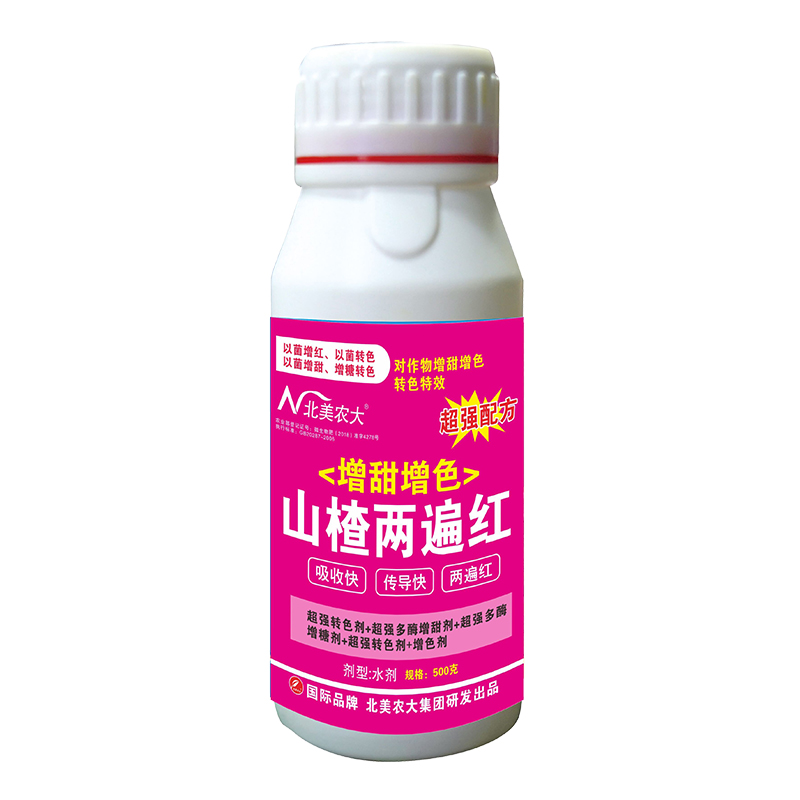 本品由北美農(nóng)大集團與中國農(nóng)科院針對山楂轉(zhuǎn)色慢、糖分少而研發(fā)的一種特效產(chǎn)品-多酶轉(zhuǎn)色增糖劑,本制劑研發(fā)方便了生物菌與多酶轉(zhuǎn)色劑+超強多酶增甜劑、超強多酶增糖劑+轉(zhuǎn)色劑、增色劑超強混合,并增強對作物一分鐘吸收,3分鐘補充營養(yǎng),10分鐘傳導在作物各個部位,其效果是同類產(chǎn)品的3-5倍,達到以菌增紅、以菌轉(zhuǎn)色、以菌增甜、增糖轉(zhuǎn)色的獨特效果。